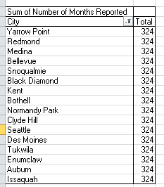 Now you need to make a critical analytical decision. A number of reporting cities exhibit either fewer than 27 years of data across the 1985-2011 swath, and/or fewer than 12 months for every year. Thus these suffer from a degree of incompleteness, and as a result you might want to partition them from the data-intact cities – because these comprise fewer than 324 reported months, i.e., 27 years times the 12 months per year. If, on the hand, you don’t care about stretches of blank cells and possible apples-and-oranges comparisons, then don’t touch that dial, or mouse. Either way, this strategy needs to be though through.