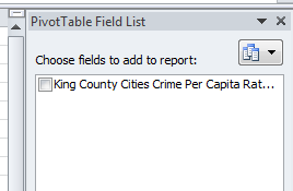 From here on, though, the issues get a bit more subtle. Row 4 bears the innocuous “To filter on a specific category…” instruction, but that little commentary imposes a real stricture upon the data. Because the text rests immediately atop the data header row, it attaches itself – dragging along with rows 1-4, too – to the crime data, thus casting the worksheet title in Row 1 into the starring role of header row. Initiate a pivot table right here and you’ll see: