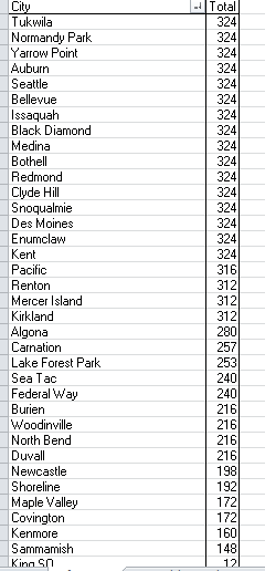 Note also that Column B – County – contains precisely the same entry in all 841 rows worth of data – the county name King, sometimes spelled uppercase, in other places with merely a capital K. This lack of differentiation thus casts the column into irrelevance, and if you’re posting the worksheet as you see it here, I’d delete the column; there’s nothing to be learned from it. But again, if you’re pivot tabling or charting the data, you can simply ignore it all.