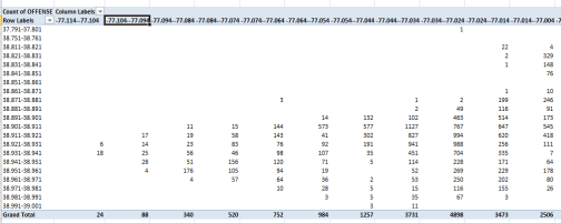 You’re starting to get the idea. We really have in effect mapped the data against their spatial correspondences; note the clustering of crimes around the -77.034/-77.024 longitude, for example, as well as the numerous blank spaces across the table, which may – probably – denote uninhabited precincts. That is to be researched, of course, but in any case the point has been established – namely that DC crimes are by no means randomly dispersed (of course a closer consideration would require a scaling of crime numbers against the populations of the locational groupings above; and by adding a second OFFENSE entry, this time to the Report Filter area, specific crime-type distributions could be bared).