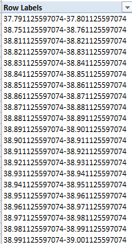 Now for a final observation today on the Group Selection feature. I had recommended a rounding of the workbook lats and longs to a 3-decimal point bore, in order to tailor the physical spaces with which we’ve been working into what could be termed sociologically practicable sizes. But there’s another, more strictly operational reason to round off: if you toss long-decimal values into a pivot table and proceed to group them, you surrender all formatting rights to the outcome. That is, if you had grouped the native 14-decimal point values and attempted to group them, they’d look something like this: