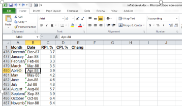 The cells in question skid down the B, or Dates, column in the inflation uk spreadsheet we introduced last week,s and they’re an eclectic bunch, styled in no fewer than three different formats, fitted out across four different ranges.