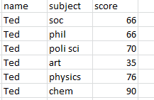 Because again, each subject continues holds to its field status; and if you do try and assign the subjects to Columns – something you might reflexively try –the subjects won’t line up alongside one another; rather, they’ll nest in precisely the superordinate-subordinate hierarchy that the Column/Row Labels areas always promote – and again, if that sounds impenetrably techie, try it, and you should see what I mean. But pile all the subjects into the same field, and now your pivot table assumes your wished-for state: