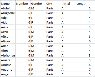 And of course, all of the above could be filtered for gender, whose field is peopled by a data curiosity. Some of the Paris names have been spooked by the X factor – that letter having stolen into their Gender fields, presumably in virtue of some documentary/administrative complication. There are but five such names, however – Noha, Felicite, Keziah, Jessy, and Alexy, all of which are sufficiently indeterminate to beg the question of how gender is registered by the French.