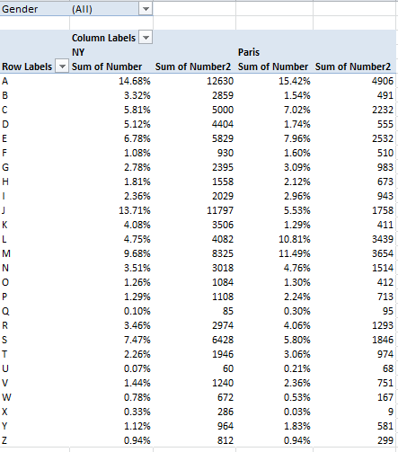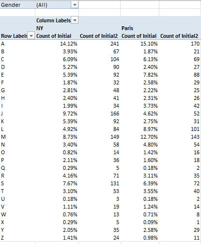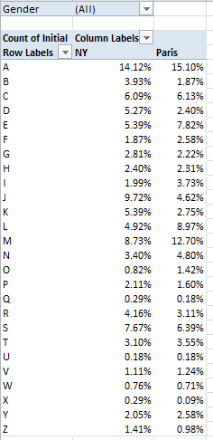 What we can do, of course, is proportion the data, by fractioning say, the ratio of A-initialed names to the respective New York-Paris wholes. This too, normalizes the data, but after a different fashion. For example, we could try out this pivot table: