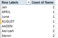 Now, pivot tables should immediately sort Row and Column Label entries; but the first four labels above clearly aren’t defaulting. I’ll admit to a thick, initial measure of puzzlement over these out-of-sorts entries, until the light bulb shined a few watts on me. Apart from qualifying as bona fide baby names, Jan, April, June, and April happen to populate Excel’s custom sort lists of the months and their three-lettered abbreviations (see File > Options > Advanced > the Edit Custom Lists button). As such, they’re indeed earmarked to rise to the top of any sort, at least by default (and note that the four month/names sort themselves in chronological order). But if you want the members of this quartet to assume their conventionally sorted place, initiate the pivot table via Insert > Pivot Table, and immediately thereafter click PivotTable Tools > PivotTable button group > Options > the Totals & Filters tab, and deselect Use Custom Lists when sorting.