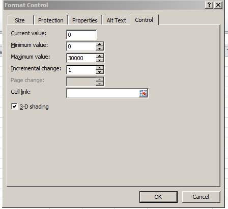 But aesthetics aside, what does the spin button do? Here’s what: clicking the button rings up a value in a specified cell (called the cell link); each subsequent click boosts or depresses that value (depending on the directional arrow clicked) by a user-defined increment/decrement).