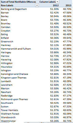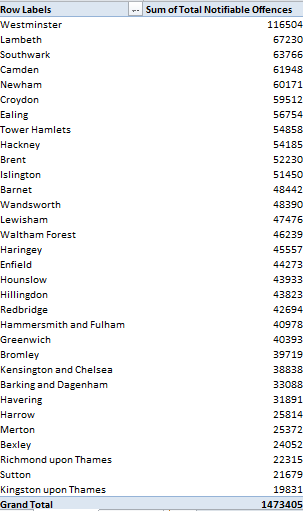 In fact, once the dust settles much of the analysis comes easily. Most evidently, perhaps (and remember the call I issued in the last post to rename all those Total columns), one could pivot table the aggregate of the Total Notifiable Offences column against London borough, and perhaps sort them largest to smallest: