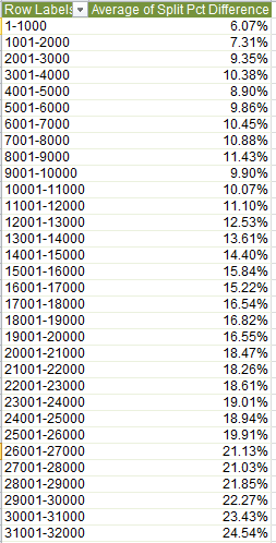 But there’s a bit more neatening up to do. I noticed a handful of #DIV/0! gatecrashers glowering in the Split Pct cells, their scruffy appearances reflecting the absences of split times in their records. If you sort Split Pct Differences smallest to largest seven dissident records plunge to the bottom, whereupon another blank row, this one interlarded between rows 36666 and 36667, will send them packing.