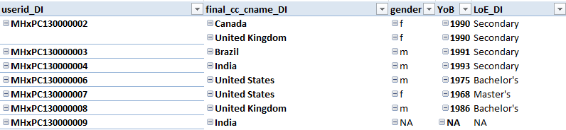 Each of the 640,000 rows IDs a student enrollment in a MOOC, and because each registrant has a Constitutionally-protected right to grab a virtual seat in more than one course the data thus do not individuate discrete students, even as that information might be something you’d want to have; after all, you might very well want to aggregate gender and nationality, for example.