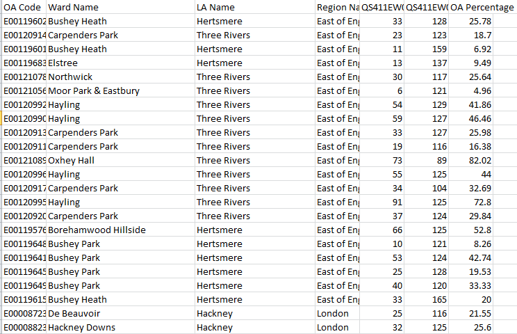 Leaving aside the perennial column-auto-fit issue, the sheet names the pertinent OAs, their superordinate Local Authority and region, and in this case, two coded references, QS411EW0005 and QS411EW0005 (base). These count the number of three-bedroom households and all homes (I’m assuming the base denotes homes here, and not residents) respectively, culminating in the OA Percentage – in a manner of speaking. The numbers in OA Percentage don’t attest a simple division of the coded data by their base, because they’re integers, an order of magnitude 100 times larger than authentic percentages; and that would at least matter were an analyst to format the values in Percentage terms.
