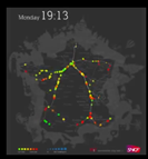 Certainly a single mapped data point could capture the variable magnitudes of two fields in tandem. For example, the stirring MIT Senselab viz Trains of Data/Trains in Time viz of French train activity across a day’s worth of traffic batches both punctuality and passenger capacity numbers in each point, by color-coding timeliness and registering capacity by point size: