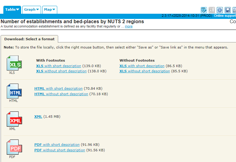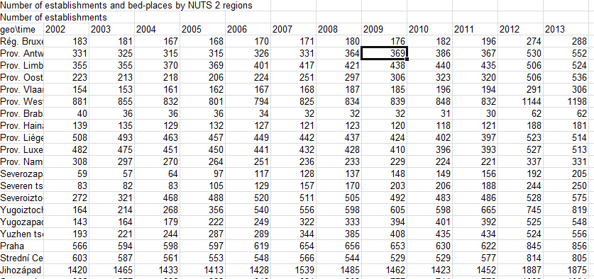 and headed in row 1 “Number of establishments and bed-places by NUTS 2 regions”, that pun-evocative acronym abbreviating Nomenclature of territorial units for statistics (look here for more), a vocabulary for hierarchically tiering EU territories by are.