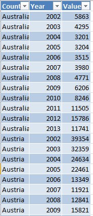 Note, on the other hand, the proper distancing of both the sheet’s title and its yearly grand totals from the body of the data with the expedient of choice, the blank rows. But at the same time recall the OECD’s invitation to its visitors to “Find core datasets…and make your own charts and tables…”. Again, our sheet assigns its yearly data to one field per year, when in fact all the years and their associated numbers would more profitably be reined into greater, subsuming fields. Not this, then: