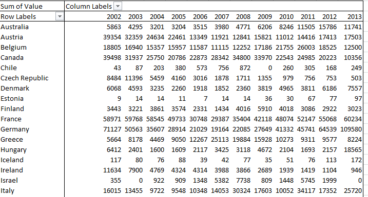 In any case one such set, a brief of statistics on asylum seekers to OECD circa 2013, seized the attention of the Guardian’s datablog (note that site’s redesign, and the disappearance of its erstwhile Data link from its home page), and is the one I think I’ve managed to capture here -even as the OECD heads its source page Stacks and flows of immigrants, 2002-2012 and so seems to have made off with a year (I’ve also retitled the workbook, overwriting its long, number-beset native name):
