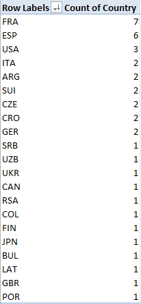 And had CoreTennis asked me, and rest assured they didn’t, I would have reassigned those three-lettered player country designations to a field all their own, and so freeing those data up to some useful pivot tabling. But as those abbreviations share a space with their citizens’ names, we might want to think about a formulaic extraction of the country codes.