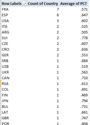 (Remember the numbers above average different players’ percentages, and as such don’t weight these for numbers of player matches played. But, those numbers are sufficiently close to accord them weighting parity, and in any event there may be good reason here to treat the individual percentages as equally contributory). Note Serbia’s (SRB) chart-topping .884. That kudo of course belongs to Novak Djokovic, but he’s a universe of exactly one. Needed here: more players to rank. And if you want to see my name in there, needed here: Ivan Lendl.