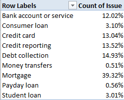 That % of Parent Row Total command is new to this blog, and merits some detailing. It works something like this: Because the Years/Month grouping naturally accords priority to years, that chronological unit is vested with a Parent status, with the kindred month rows sired as a kind of progeny. The above screen shot fits subtotals within subtotals, then; 2013’s 32.36% marks that year’s slice of all consumer complaints, but its monthly percentages proportion themselves not to all months in turn, but only those contributory to 2013’s totals. Thus January’s 9.07% is 2013-specific, even as the strikingly scant 4.50% for the previous January binds itself to 2012 alone. It’s what % of Parent Row Total does.
