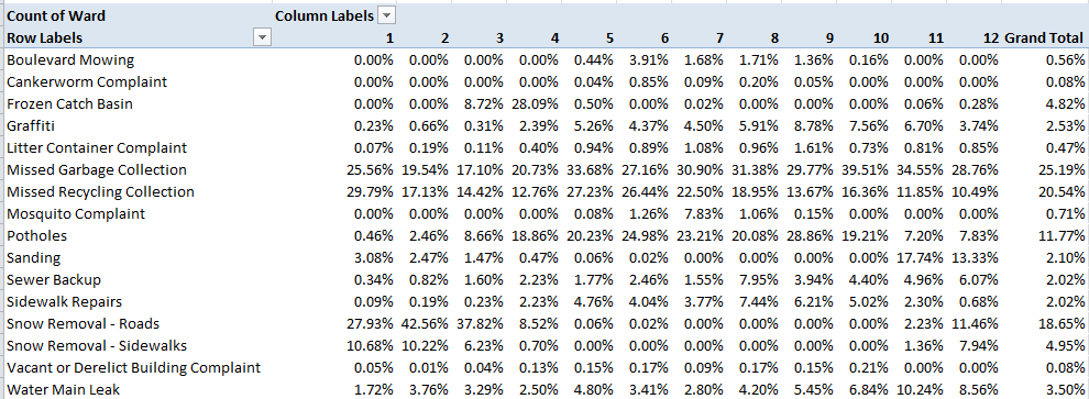 In any event, it snows in Winnipeg, about 45 inches a year (including 4.2 inches last April), and as such you’ll want to find something out about the 311 dialers having something to say about that meteorological shakeout. Start with this time-sensitive pivot table: