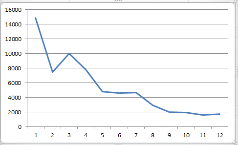 Once charted (say by Month and one of the Values fields), the curious near-linearity of months and calls describes itself:
