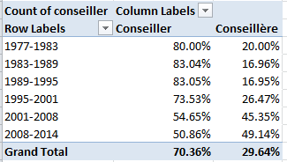 A most interesting and emphatic incline toward gender-count parity informs the table. Remember, however, that the above accords multiple counts to the same conseillers serving across multiple mandatures; if you want to break out discrete, actual conseillers by gender, then, the process gets trickier, because if you go with:
