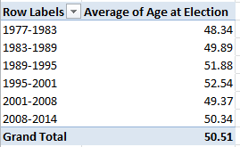 The consistency is notable, though the average age ascent – about four years, between 1977-2001 and 1995-2001 – may reflect large numbers of triumphing incumbents, all of whom of course aged about six years between elections.