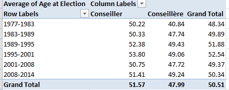 That is, subtract the number of days separating a conseiller’s birthdate from the day on which he/she was elected, and divide the total by the average day-length of a year. Then head towards this pivot table: