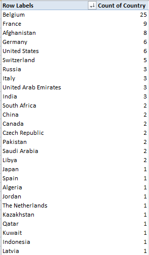 Three columns and but 116 rows worth of official trips should prove eminently workable, but let’s see. As intimated above, the data underwent a change or two from after their coming out some days ago. The companion Guardian story reports 47 countries among the Prime Minister’s line-of-duty destinations, but if you had run this pivot table on the original data (though if you hadn’t see those you’ll have to trust me here):