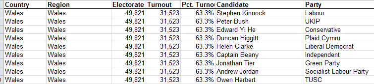 What does that mean? Start with the Turnout data, recording the absolute numbers of constituency- eligible voters making their way to the polls. Apropos the first-listed Aberavon district in Wales, its row 1 turnout figure of 31,523 is obviously in no way enhanced or value-added by the eight additional recitations of the number attaching to each Aberavon candidate. But how else, then, could turnout be represented?