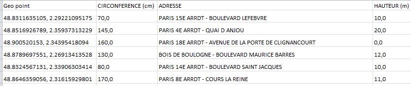 And about the numbers themselves: I don’t know about yours, but my download aggrandizes the Circonference (tree circumference) and Hauter (height) values with a comma – the French representation of a decimal point – and a meaningless trailing zero, neither of which appear in the data as framed on the Open Data site: