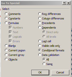 Now there’s at least one other remarkable feature of the Profiles sheet, this time of the formatting kind. I had advanced the guess to myself that the variously colored, merged header cells in the A column had been treated to some manner of conditional formatting, but it turns out they hadn’t been. By way of verification, tap F5 and click Special… on the resulting Go To dialog box and you’re admitted to its Go To Special box, wherein if you click Conditional formats: