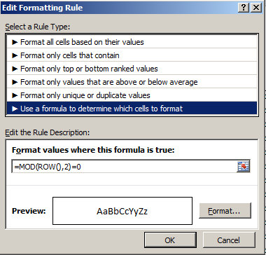 That formula tells us that any cell whose row number yields a remainder of 1 when it’s divided by 2 as per the MOD function should be formatted in the above gray. The other condition: