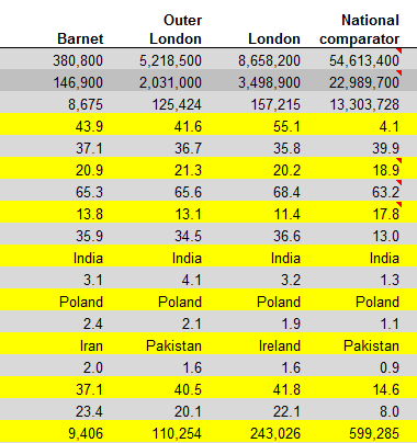 Then scroll down Barnet’s borough attributes in Profile’s C column and observe the VLOOKUP column number references stationed in their formulas, each upped by an increment of one from the previous formula one row up, and each receiving that value from the lookup’s A as above – a column that has no concerted role to play in the workbook apart from its 76 numbers, sorted highest to lowest.