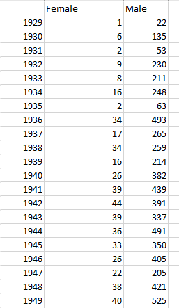 The respective aggregates: 2,527 and 23,269, a disparity needing to recognize the nearly 25% of the Gender cells that are unfilled (note that Jacobson’s dataset discloses a blanks count of around 15%.) In any case, we learn that more than 9.2 times as many men are represented among the exhibitors than women – maybe. I’m equivocating for two reasons: first, the ExhibitionRole field names seven statuses by which an individual could be described, only one of which is Artist (in addition to the Blanks residual category); and while the great majority of entries are so identified, an exclusion of the non-Artist entries need be imposed, and via the following refinement: